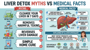 “Liver detox” products, juices, and cleanses are often unnecessary. Your liver naturally detoxifies the body every day. Most detox claims are myths. Real liver health depends on balanced diet, weight control, limited alcohol, and medical guidance. If you have symptoms like fatigue, bloating, or abnormal reports, consult a dr liver specialist or search for a liver specialist doctor near me instead of relying only on detox trends or general care at stomach hospitals near me.
